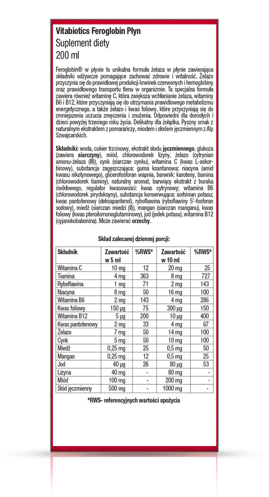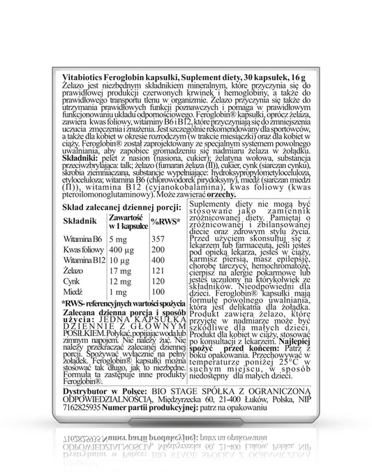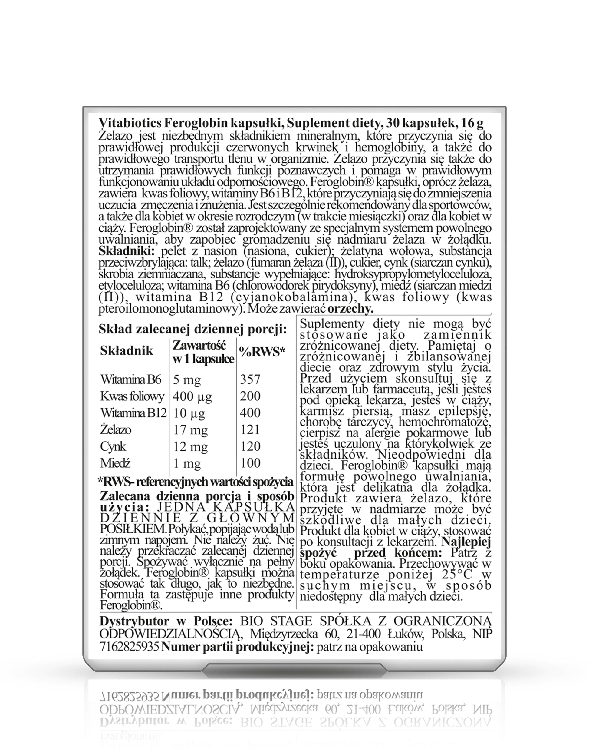 Iron contributes to the proper formation of red blood cells and hemoglobin and the proper transport of oxygen in the body. Hemoglobin transports oxygen to the brain, heart, muscles and tissues throughout the body. Excess iron in the stomach is prevented by the special slow release system of Feroglobin. This ensures a gradual, even release of nutrients that make up the blood. Therefore, it is gentle on the stomach.