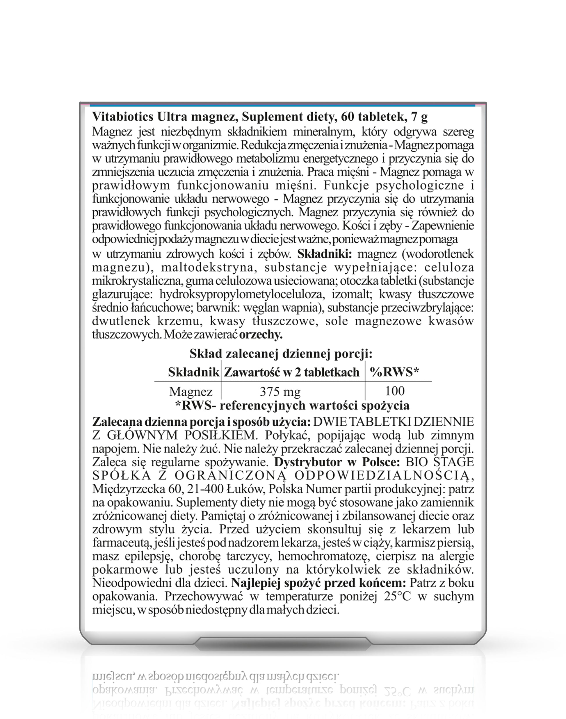 Magnesium plays many important roles in the body, including helping to maintain healthy bones and teeth. Two Ultra Magnesium tablets provide 100% (375 mg) of the Nutritional Reference Value (NRV%) of magnesium.