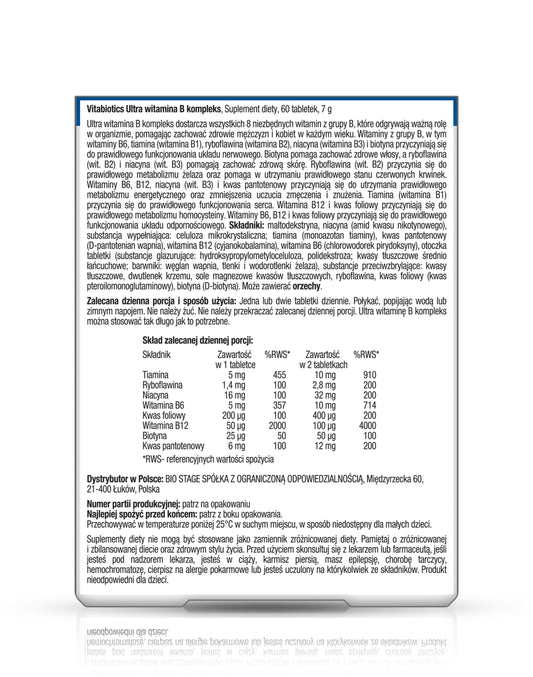 Ultra Vitamin B Complex dostarcza witaminy B o jakości British Pharmacopoeia i zawiera wszystkie osiem niezbędnych witamin z grupy B: tiaminę (witaminę B1), ryboflawinę (witaminę B2), niacynę (witaminę B3), kwas pantotenowy (witaminę B5), pirydoksynę (witaminę B6), biotynę (witaminę B7), kwas foliowy (witaminę B9) i cyjanokobalaminę (witaminę B12).